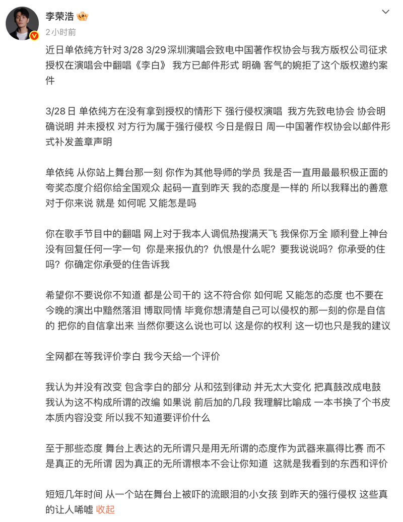 澳门规博彩十大网站3月29日,歌手李荣浩在社交平台发布长文,公开控诉歌手单依纯在3月28日和3月29日的深圳演唱会上,未经授权翻唱其代表作《李白》,构成明确版权侵权行为。两个小时后,单依纯也在社交平台做出简单回应:“我理解李老师此刻的心情,首先我很抱歉。我会和团队尽快搞清楚状况,给大家一个答复”,并表示“深知版权意识的重要性,也一定会把这个红线标清”。